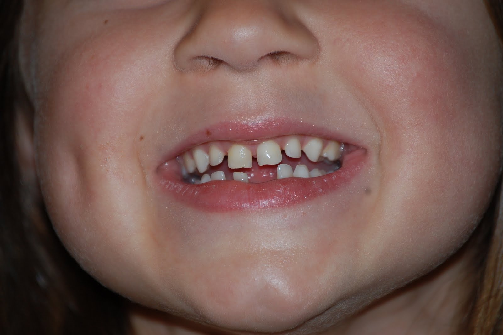 She naturally has teeth that are spaced quite a bit apart...and so the space is a little less evident! However, days after this tooth fell out we are awaiting the loss of the one next to it!